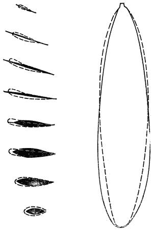 Фото 47. На снимке справа совмещены в масштабе контуры крылатки ясеня (штриховая линия) и лопасти пропеллера крупного пассажирского самолета (сплошная линия). Слева даны контуры поперечного разреза лопастей, сделанные на различных участках общей их длины. Отчетливо видно, что основные технические характеристики обеих конструкций (отношение ширины к длине и величина угла атаки) совпадают.