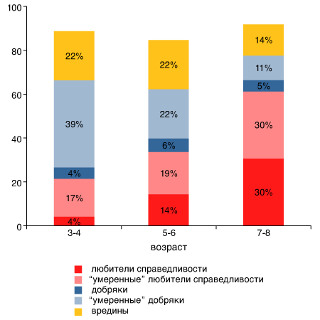 Среди детей есть около 5 % добряков, беззаветных альтруистов, которые всегда заботятся о других, и доля таких детей не меняется с возрастом. Есть «вредины», которые пытаются все отобрать у других и никому ничего не дают. Их число снижается с возрастом. И есть «любители справедливости», которые стараются все поделить поровну, и доля таких детей стремительно растет с возрастом.