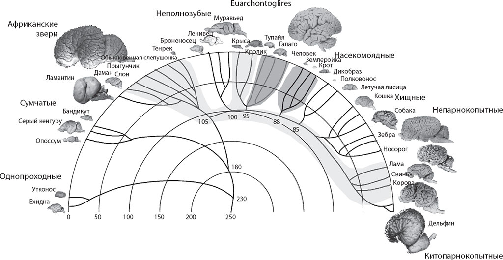 Структурно– и порядково-специфичные правила нейронного шкалирования также говорят нам о природе эволюционных изменений, лежащих в основе расхождения и обособления коры и мозжечка приматов, мозжечка насекомоядных и остальных частей мозга парнокопытных. Оказалось, что мы можем вполне уверенно судить о том, что происходило, когда эти клады млекопитающих возникали как новые линии. Эти суждения стали возможными благодаря сравнительно простому математическому анализу.