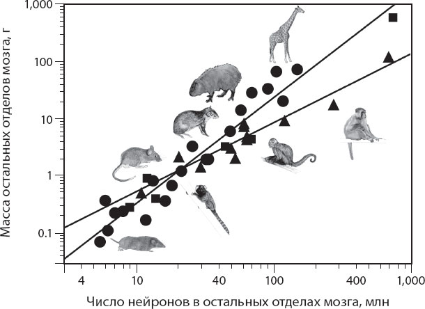 Рис. 4.12. Масса остальных частей мозга увеличивается одинаково у африканских зверей (квадратики), грызунов, насекомоядных и парнокопытных (кружки) по мере роста числа нейронов, но картина меняется у приматов (треугольники). Линии графика соответствуют степенным зависимостям, которые наилучшим образом описывают изменения массы остальных частей мозга как функции числа нейронов в этих структурах у приматов (показатель степени +1,2) и у остальных клад (показатель степени +1,9). При сравнимом числе нейронов остальных частей мозга эти структуры намного меньше у приматов, чем у других животных