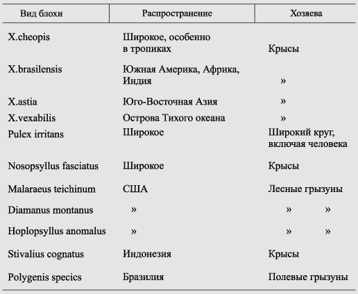 Таблица 5. Наиболее важные виды блох — переносчиков чумы и их хозяев за пределами СНГ [Butler Т., 1983]