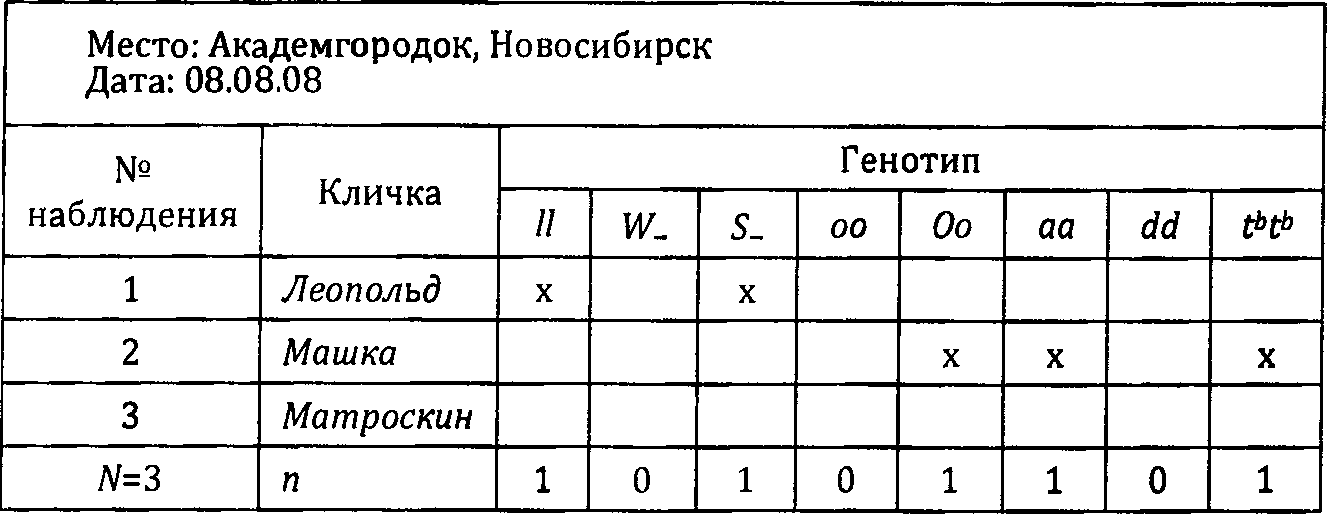 Это экономит время, но потом такую запись неудобно обрабатывать статистически. Гораздо удобнее заранее расчертить в записной книжке таблицу, которую я предлагаю вашему вниманию ниже. В ней обозначены все мутации, а на ходу вы в каждую строку записываете генотип наблюденного кота, ставя крестики в тех столбцах, где надо. Наши примеры в этой таблице будут записаны следующим образом.