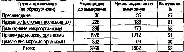 При анализе изменений на родовом уровне (всего учтено 2868 родов) тот же автор установил величину вымирания около 50 %, наиболее сильного среди морских организмов (табл. 1).