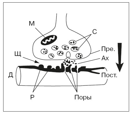Р – рецепторы и поры (Поры) дендрита (Д) следующего нейрона; стрелка – одностороннее проведение возбуждения