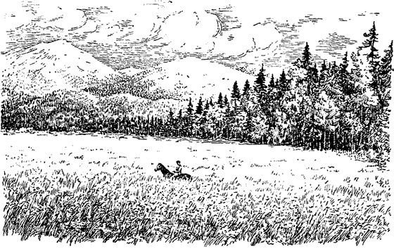 Круглый год — и зимой и летом — вершины самых могучих Алтайских гор одеты вечными снегами, а склоны их покрыты густыми лесами пихт, лиственниц и раскидистых кедров. Нередко леса прерываются кустарниками и открытыми полянами. Но поляны эти только называются «открытыми». На них так же легко заблудиться и потерять друг друга, как в густом лесу, и пробираться по ним можно только верхом на лошади, да и то с трудом. Так высоки и густы там травы, что даже всадник скрывается в них с головой.