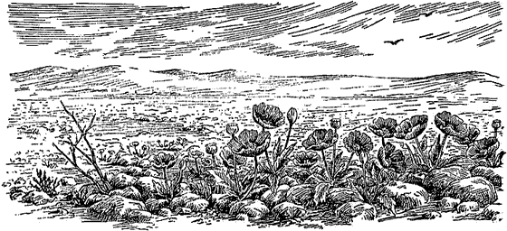 В десять-пятнадцать дней тундра становится неузнаваемой. Среди низкой, но густой зелёной травы, среди мхов, на лужайках появляются полярные цветы: темноголубые незабудки, золотистые лютики. Целыми полянами зацветают жёлтые полярные маки.