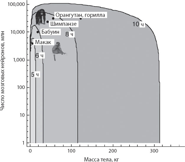 Уравновесив потребление калорий и их расход для мозга и тела, который зависит от массы тела, числа мозговых нейронов и числа часов, потраченных на добывание и потребление пищи, мы смогли определить и изобразить «зоны жизнеспособности»: сочетания массы тела, числа мозговых нейронов и часов, потраченных на добывание и потребление пищи, которые можно было бы поддерживать при поглощении установленного числа килокалорий при данных условиях, как это показано на рис. 10.3. Тот факт, что такие зоны вообще удалось обозначить, указывал, что на самом деле потребление калорий является лимитирующим фактором не только размера тела, но и числа нейронов в мозге, которое мог позволить себе примат в зависимости от числа часов, потраченных на кормодобычу в течение суток.