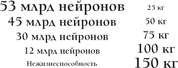 Очень важна форма зон жизнеспособности, показанных на рис. 10.3: даже для приматов, которые могут потратить 10 часов на добывание и потребление еды, эти зоны круто снижаются справа. Это означало, что существует определенный предел количества нейронов, которое может позволить себе примат с определенной массой тела (максимальная вертикальная величина каждой кривой на рис. 10.3), но не только это, но еще и то, что после определенного значения увеличение массы тела может происходить довольно дорогой ценой: либо добывание и потребление еды в течение более долгого периода (то есть выход за пределы кривых, обозначенных на рис. 10.3), либо, если это невозможно, уменьшение числа нейронов в головном мозге.