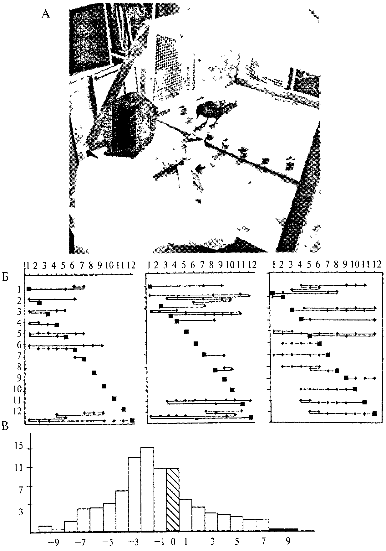 А — обстановка эксперимента на врановых птицах в лаборатории Л В Крушинского, Б — результаты решения теста галкой (слева), павианом-анубисом (в середине) и серой крысой (справа); по вертикали отложены предъявления теста, по горизонтали — номера кормушек; положение приманки обозначено квадратом, неправильные реакции животного отмечены ромбами, соединенными линией, правильное (без предварительных ошибок) решение обозначено одиночным квадратом: В — гистограмма распределения первых выборов кормушек (см текст).