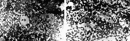 Инфекционные заболевания предстательной железы. Вероятно, наиболее распространенным заболеванием предстательной железы после доброкачественной гиперплазии является бактериальный простатит. Среди микроорганизмов, вызывающих данное заболевание, следует назвать E. coli, Proteus spp., Pseudomonas spp., Brucella cants., Mycobacterium spp., стафилококк, стрептококк, вирус чумы собак и Blastomyces dermatitidis. Микроскопическое исследование секрета предстательной железы выявляет наряду с нормальными здоровыми клетками простаты многочисленные полиморфноядерные клетки, эритроциты и иногда бактерии (фиг.7.4).