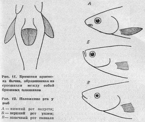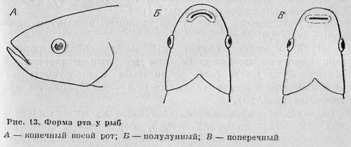 Рот у рыб бывает верхним, конечным и нижним в зависимости от его расположения (рис. 12). По форме ротовой щели различают косой, полулунный и поперечный рот (рис. 13).