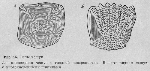 Чешуя у рыб, обитающих в водоемах Подмосковья, бывает двух типов: циклоидная — с гладкой наружной поверхностью; ктепоидная — с шершавой зазубренной поверхностью (рис. 15).