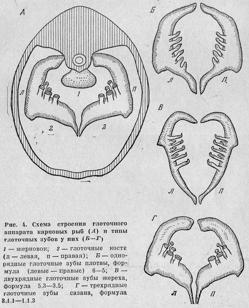 Глоточные зубы — зубы, сидящие на глоточных костях. Бывают однорядными, двухрядными и трехрядными. Число зубов в каждом ряду обозначается цифрами отдельно для левой и правой глоточных костей (рис. 4).
