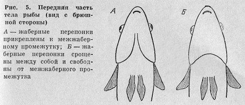 Жаберные перепонки — перепонки, окаймляющие жаберные отверстия внизу головы. Они могут срастаться друг с другом и быть свободными от межжаберного промежутка или прикрепляться к межжаберному промежутку, не срастаясь между собой (рис. 5).