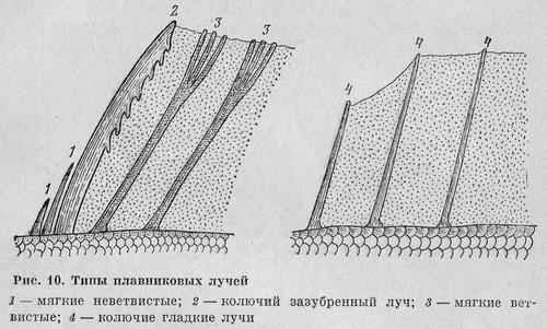 Лучи плавников, соединенные между собой перепонкой, образуют плавник. Бывают мягкими и жесткими. Мягкие лучи могут быть ветвистыми и неветвистыми; жесткие лучи бывают гладкими или с зазубренными колючками (рис. 10).