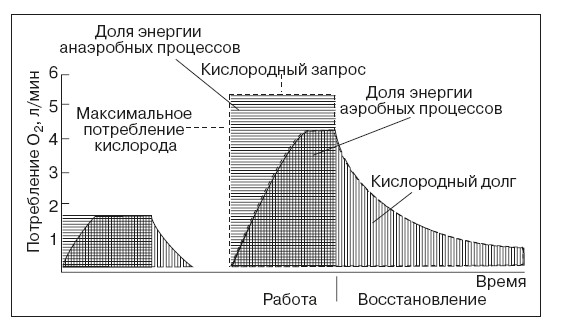 Такая работа относится к анаэробным алактатным нагрузкам, т. е. выполняется на 90–95 % за счет энергии фосфагенной системы АТФ и КрФ. Единичные энерготраты предельные и достигают 4 ккал/с, зато суммарные – минимальны (около 80 ккал). Огромный кислородный запрос (порядка 8 л или в пересчете на 1 мин ~ 40 л) во время работы удовлетворяется крайне незначительно (менее 0,1 л), но кислородный долг не успевает достичь большой величины из-за кратковременности нагрузки. Короткий рабочий период недостаточен для заметных сдвигов в системах дыхания и кровообращения. Однако в силу высокого уровня предстартового возбуждения ЧСС достигает высокого значения – до 200 уд,/мин, В результате активного выхода из печени углеводов в крови обнаруживается повышенное содержание глюкозы – гипергликемия.