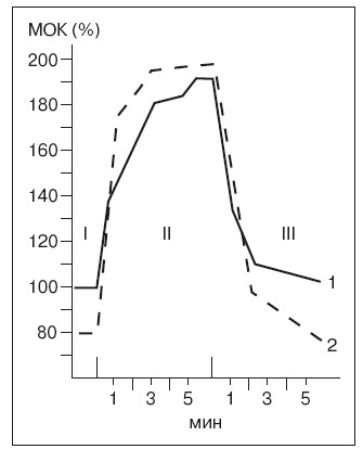 Рис. 52. Изменение МОК у нетренированных (1) и тренированных (2) мальчиков 7–8 лет при выполнении стандартной нагрузки: