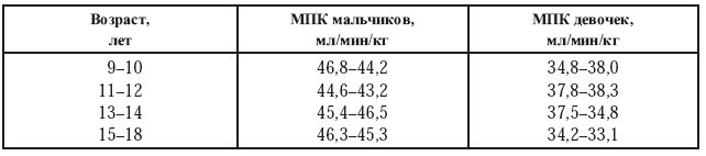 Аэробные возможности детей нарастают с возрастом, увеличиваясь в абсолютных значениях МПК (л/мин) примерно до 15 лет. У мальчиков МПК составляет в 7–8 лет – 1,3 л/мин, в 8–9 лет – 1,5, в 9-10 лет – 1,6, в 10–11 лет – 1,7 л/мин. Эти значения гораздо ниже, чем у взрослых. Однако относительные величины МПК (мл/мин/кг) у детей очень высоки, близки к показателям нетренированных взрослых лиц, а у некоторых детей даже превосходят их. У мальчиков младшего школьного возраста значения МПК превышают эти показатели у девочек (табл. 23).