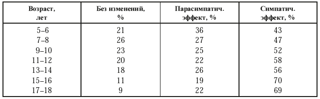 Вращательные нагрузки вызывают у детей дошкольного и младшего школьного возраста отличную от взрослых реакцию сердечно-сосудистой системы. У них по сравнению со взрослыми наблюдается большая доля парасимпатических эффектов (замедления ЧСС) и меньшая доля симпатических эффектов (учащением ЧСС), а также более частое отсутствие изменений ЧСС (табл. 24).