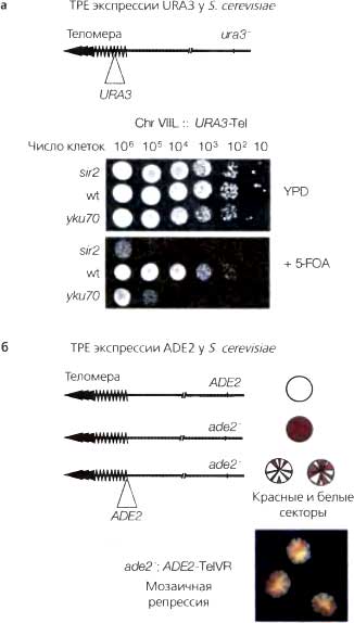 (а) Ген Ura3, встроенный рядом с простыми TG-богатыми теломерными повторами в левом плече VII хромосомы, подвергается сайленсингу теломерным гетерохроматином в данном штамме дрожжей. При выращивании на обычной богатой среде (YPD) не наблюдается различий между клетками дикого типа (wt), клетками с репрессированным субтеломерным геном Ura3 и мутантами по сайленсингу, у которых теломерный гетерохроматин утрачен, а ген Ura3 экспрессируется. На среде, содержащей 5-FOA (нижняя панель), с другой стороны, клетки с репрессированным геном Ura3 (например, клетки дикого типа) могут расти, а клетки, экспрессирующие его (sir2nyku70 мутанты), не могут. Это объясняется тем, что продукт гена Ura3 превращает 5-FOA в токсичный интермедиат 5-фторурацил. Тест с серийными разведениями позволяет детектировать события сайленсинга даже при частоте 1 на 106 клеток.