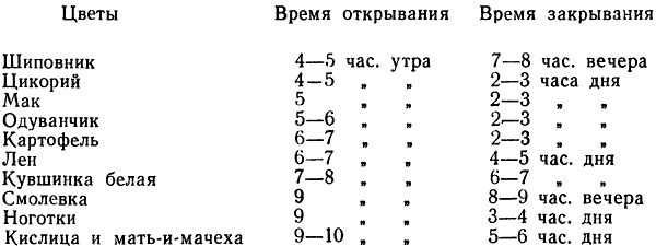 Эти показания примерные. В каждой местности «цветочные часы» идут по-своему. Если обычные часы меняются в зависимости от меридиана, то есть долготы, то «часы цветочные» меняются от широты, в зависимости от длины дня. Первые «часы флоры» открыл и составил в XVIII веке Карл Линней для окрестностей Упсалы в Швеции, и обычно их приводят в книгах без проверки.