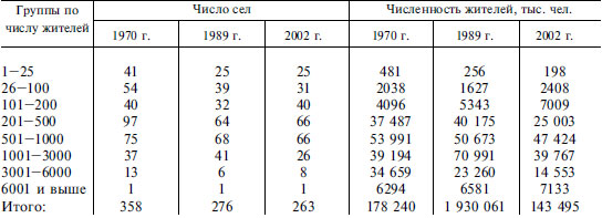 Оценка численности и размещения постоянного населения в селах приграничных районов, приводимая по итогам трех последних переписей, показывает снижение численности населения во всех поселениях. Степень потерь населения селами неодинакова. Почти вдвое сократилось число мелких сел, с соответствующей потерей населения. Это коснулось в основном удаленных от районных центров сел, в остальных селах потери населения носят характер внутрирайонных миграций, административно-территориальных преобразований, естественных потерь. Достаточно стабильными выглядят села с численностью населения 100–200 чел. Их число в межпереписной период практически не изменилось, а численность проживающего в них населения увеличилась. За этот же период пограничные поселения потеряли 95 сел и почти 35 тыс. жителей (табл. 14.3).