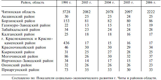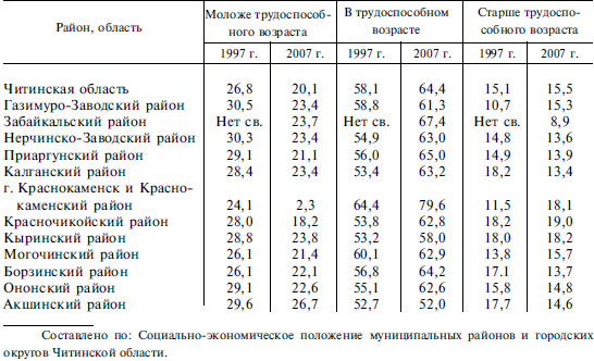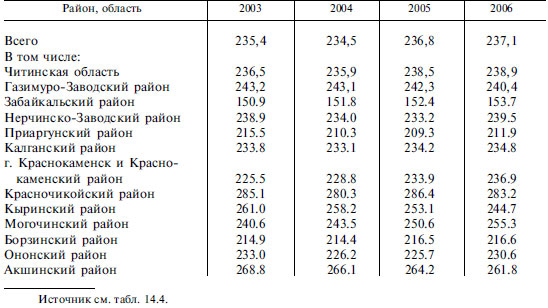 Особое положение занимает Могочинский район, в заселении и развитии которого огромную роль сыграла Транссибирская магистраль. Сложные природные условия затрудняют развитие сельского хозяйства. Концентрация населения у линии железной дороги, функциональная специфика поселений (разъезды, мелкие станции) сформировали здесь небольшие и средние села, а именно с численностью населения: 125 чел. – 13 поселений; 25-100 чел. – 20 поселений. Основная часть мелких поселений сохраняется на протяжении последних 40 лет благодаря сохранению своей функциональной специфики. Причем в динамике последних 10 лет происходило увеличение доли трудоспособного населения во всех районах, кроме Акшинского. Но повсеместно сокращалось население в возрасте моложе трудоспособного (табл. 14.4).