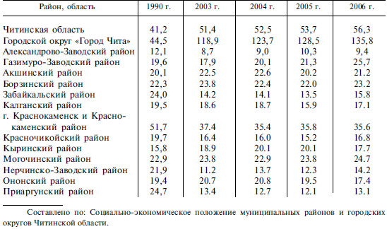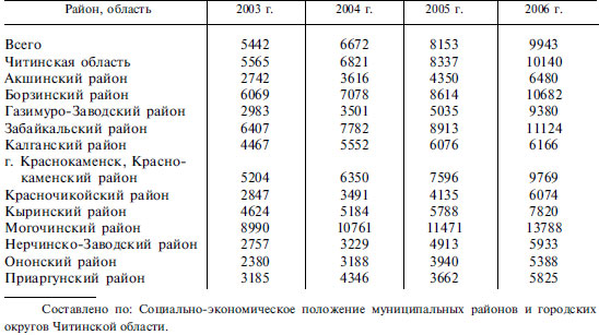 Отмечаемый в динамике рост номинальной начисленной заработной платы не достигает уровня таковой в среднем по области и не означает роста доходов населения. Более значительный рост заработной платы в Газимуро-Заводском районе в 2003–2005 гг. объясняется высокими зарплатами на геолого-разведочных и горно-добывающих предприятиях. В лучших условиях по сравнению с другими группами работающего населения находятся работники железной дороги, связи, старательских артелей, аппарата управления и некоторых других предприятий, имеющих более высокую зарплату, чем в среднем по отраслям хозяйства. Низкий уровень доходов отражается и в снижении покупательной способности населения, хотя индексы физического объема оборота розничной торговли растут, но происходит это благодаря росту цен на товары и услуги. В селах роль зарплаты в совокупных доходах семей невелика, важнейшую роль играют личное подсобное хозяйство, пенсии и различные виды пособий: на детей, по социальному страхованию, пособия многодетным матерям.