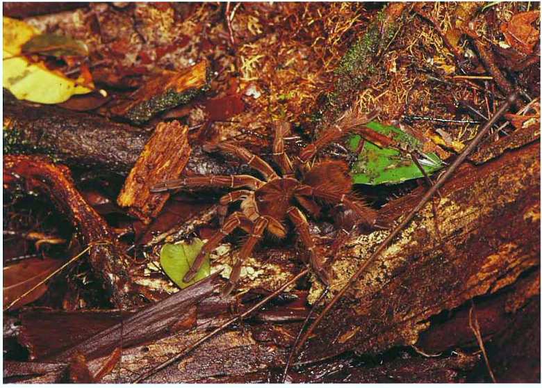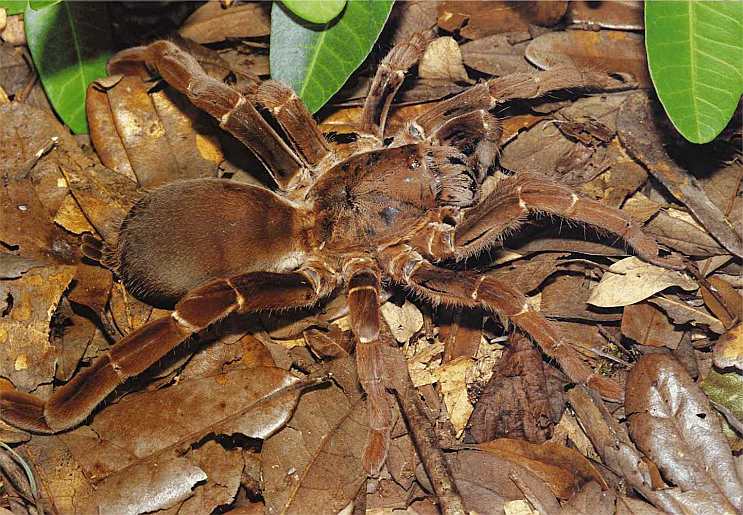 Большой паук-птицеед, относящийся к мигаломорфам, блуждает по нижнему этажу влажного тропического леса в Амазонии. Он может ловить кузнечиков, мышей и даже небольших птиц.