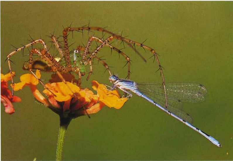 Ничего не подозревающая об опасности стрекоза вот-вот будет схвачена зеленым пауком-рысью (Peucetia viridans). Паук будет действовать настолько молниеносно, что она даже не успеет улететь.