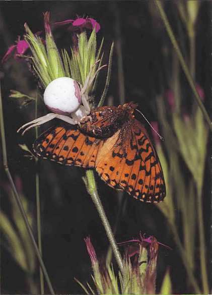 Этот паук-краб (Misumena vatia) поймал бабочку-перламутровку. Высосав из ее тела всю жидкость, паук за ненадобностью выбросит сухой каркас насекомого.