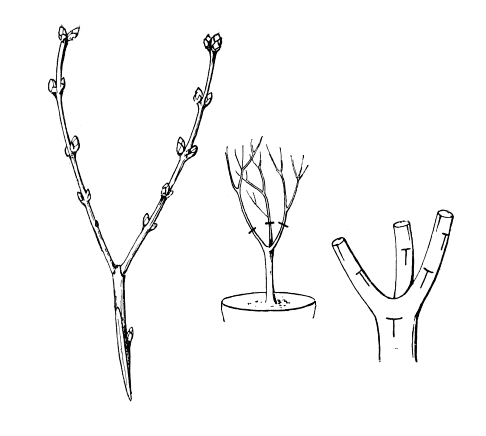 В центре: схематично показаны границы среза скелетных сучьев при перепрививке взрослых растений в зимних условиях. Справа: правильное расположение Т-образных надрезов при прививке на одно растение нескольких веточек. Расположение надрезов одного под другим препятствует равномерному и правильному поступлению питательных веществ к выше расположенным прививкам, что нередко приводит к их отмиранию. Слева: веточка, вставляемая в верхний надрез