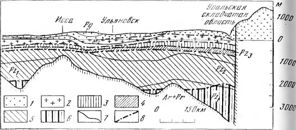 Рис. 17. Схематический разрез Волго-Камского артезианского бассейна (по Б. Н. Архангельскому, 1958).
