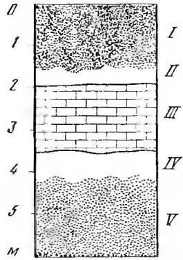 Водоупорные породы: I и V — красный алевролит; II в IV — оглеенный алевролит. Водопроницаемые породы: III — трещиноватый известняк