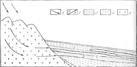 1 — пути инфильтрации кислородных вод; 2 — граница между зонами с окислительными условиями (О) и восстановительными условиями (В); 3 — песчаные водоносные горизонты; 4 — водоупорные глины; 5 — области питания артезианских вод, сложенные скальными трещиноватыми породами
