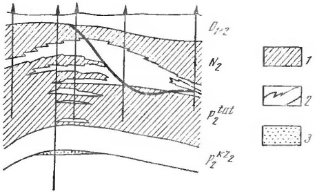 1 — красноцветные отложения; 2 — сероцветные измененные породы; 3 — нефтяная залежь