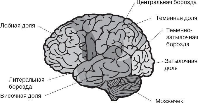 Три главные борозды — центральная, боковая и теменно-затылочная — делят каждое полушарие на четыре доли: лобную, теменную, затылочную и височную. Нижняя поверхность полушарий вместе со стволовой частью мозга называется «основанием мозга».