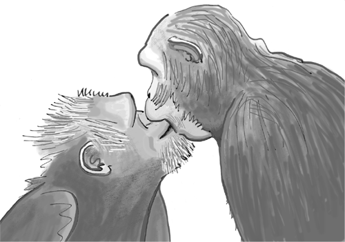 С моей точки зрения, антропоморфизм представляет собой проблему, только если сравнение выглядит натяжкой, как в случае с видами, далекими от человека по происхождению. Например, рыбки, именуемые целующимися гурами, целуются другим способом и по иным причинам, чем человек. Взрослые рыбки смыкают свои выступающие вперед рты, чтобы разрешить конфликт. Называть это поцелуем — заблуждение. В то же время человекообразные обезьяны на самом деле приветствуют друг друга после разлуки поцелуями в губы или в плечо, то есть тем способом и при таких обстоятельствах, которые очень похожи на человеческий поцелуй. Бонобо в этом смысле продвинулись еще дальше. Когда один владелец зоопарка, знакомый с повадками шимпанзе, но не имевший опыта общения с бонобо, наивно разрешил бонобо себя поцеловать, он был шокирован тем, что бонобо активно использует при этом язык!