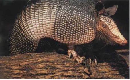 Защищенный костным панцирем, девятипоясный броненосец уверенно движется по травяному покрову леса. При угрозе со стороны хищника он сворачивается в шар и остается в таком положении, пока опасность не минует.