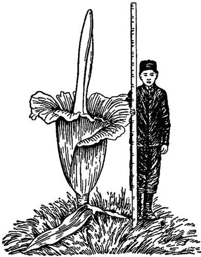 На том же острове Суматре, в тех же дебрях, где водится раффлезия, можно где-нибудь в сырой низинке встретить еще одно растительное чудище. Его тоже можно обнаружить издали по смрадному запаху, привлекающему мух — любительниц падали. Представьте себе такое растение. Из подземного клубня в полметра диаметром тянется толстенный стебель, в нижней части которого видны обрывки первого листа, в который все растение бывает закутано, когда начинает расти. Повыше — чехол вроде огромного складчатого воротника. Из этого чехла высовывается длинный, обернутый листом стержень. Этот стержень — бесплодная верхушка, возвышающаяся над ярусами цветов, скрытых внутри чехла.