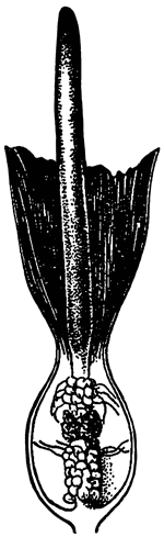 Любопытно, что привлеченные запахом насекомые решительно ничего для себя съедобного в цветах не находят: никакого меда там нет. Чего же ради они лезут? Может быть, иногда их привлекает теплый уголок. С другой стороны, нетрудно подметить, что мухи от запаха аройника точно пьянеют, возбуждаются, начинают гоняться друг за другом и в таком состоянии влетают в чехол.