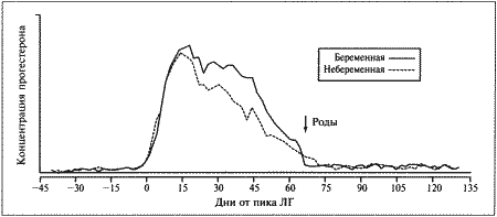 При беременности лютеиновая фаза длится около 63 дней (от овуляции до родов), тогда как в отсутствие беременности ее продолжительность составляет около 66 дней. Снижение уровня прогестерона, характерное для второй половины беременности, сопровождается одновременным повышением уровня пролактина. Пролактин вырабатывается гипофизом и обладает лютеотрофическим действием; поддерживая функцию желтых тел, он способствует сохранению повышенной концентрации прогестерона. Угнетение секреции пролактина вызывает резкое прерывание лютеиновой фазы. У беременных сук концентрация пролактина повышается приблизительно в 4 раза, однако у некоторых животных наблюдается повышенная концентрация пролактина и в отсутствие беременности, что следует считать индивидуальной особенностью. Лютеинизирующий гормон (ЛГ) является еще одним лютеотрофическим агентом, подавление его секреции может вызывать рассасывание желтых тел. С наступлением беременности динамика секреции ЛГ не изменяется. Интересно отметить, что в течение первых 15 дней после овуляции желтые тела существует автономно, ограничиваясь минимальной лютеотрофической поддержкой.