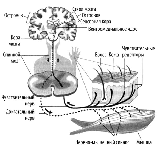 От среднего мозга сенсорная информация далее проходит через заднее вентромедиальное ядро таламуса (ВМЯ; участок мозга размером с лесной орех), в котором формируются сложные реакции организма, такие как «какой ужасный вкус», «что за вонь» или «это прикосновение возбуждает». Постепенно обработанная информация собирается в двух отделах новой коры, называемых островками мозга. Эти структуры размером с небольшой палец локализованы на правой и левой стороне коры. Артур Крейг из Неврологического института Барроу в Финиксе (Аризона) определяет ВМЯ и островки как «систему, представляющую меня в материальном мире»[64].