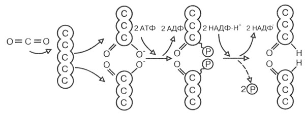 Рис. 14. Фиксация углерода, его фосфорилирование и восстановление