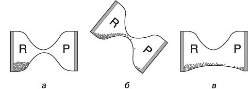 Рис. 3.2. Смена энергетического ландшафта: а) молекулы могут перейти из сосуда с исходным веществом в сосуд с продуктом реакции, однако им необходима дополнительная энергия для достижения переходного состояния (чтобы попасть в горловину часов); б) если приподнять левый сосуд часов, молекулы исходного вещества (субстрата) приходят в состояние с большей энергией по сравнению с продуктом, что позволяет им легко проникать в правый сосуд; в) ферменты стабилизируют переходное состояние, снижая энергетический барьер (расширяя горловину наших часов), упрощая превращение молекул субстрата в молекулы продукта реакции. На рисунке R (reactants) — вещества, участвующие в реакции; P (products) — продукты реакции