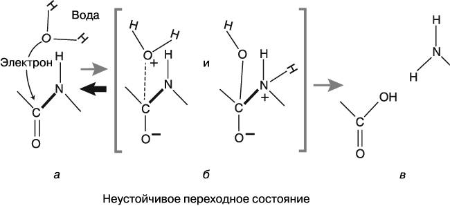 Подобное происходит нечасто. Дело в том, что переходные состояния (как, например, то, которое мы изобразили на рис. 3.3, б) очень кратковременны. Они настолько неустойчивы, что разрушаются легчайшим «толчком». Например, отрицательно заряженный электрон, который отдает молекула воды, легко возвращается назад и исходные вещества принимают прежнюю форму (на рисунке это показано жирной стрелкой). Такой сценарий гораздо более вероятен, чем реакция, в результате которой разрушается пептидная связь. Обычно пептидные связи не разрушаются. Так, в нейтральных растворах (не в кислых и не в щелочных) пептидная связь белка разрушится лишь наполовину более чем за 500 лет (этот временной отрезок называют периодом полупротекания реакции).