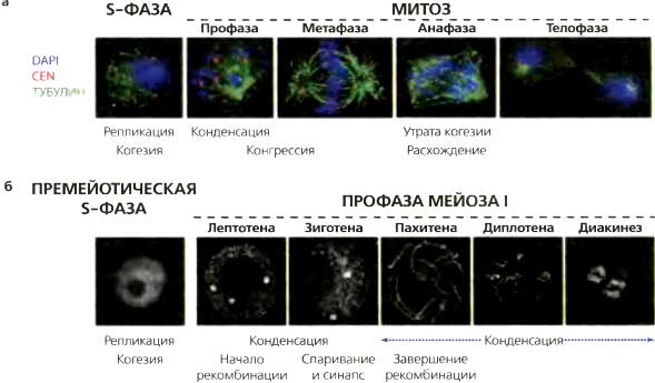(а) Микрофотографии клеток Drosophila показывают поведение хромосом (синий цвет, описание см. ниже), микротрубочек (зеленый цвет) и центромер (красный цвет) в интерфазе и митозе, (б) Поведение хромосом показано для профазы мейоза I у кукурузы; это стадия, на которой происходят спаривание гомологов, синапсис и рекомбинация (микрофотографии предоставлены Hank Bass и Shaun Murphy, Университет штата Флорида). Ключевые функции хромосом на каждой стадии показаны внизу (синим шрифтом). Впоследствии, в анафазе мейоза 1, гомологи расходятся к противоположным полюсам, завершая редукционное деление. Сестринские хроматиды разделяются лишь во время мейоза II (рис. 14.9)