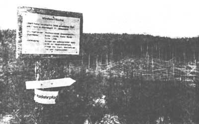 Можно ли было предвидеть и предотвратить эту катастрофу? Недалеко от тех мест, где пострадал лес в 1972 году (фото 53), еще в 1958 году сильные ветры «прорубили» широкую просеку в сосновом лесу. Что же сделали лица, ответственные за ведение лесного хозяйства? Вдоль поврежденных участков леса местные органы проложили своего рода учебную тропу и выставили на ней щит, на котором перечислялись все те меры, которые необходимо предпринимать во избежание повторения подобных случаев: «Защитные полосы закладывать перпендикулярно к основному направлению ветров. Осуществлять смешанные посадки глубоко- и мелкоукореняющихся деревьев (ель), а также тех культур, которые успешно противостоят сильным ветрам: европейской лиственницы, сосны, пихты, дуба, липы». Но сколь бы похвальным ни был факт установки этого щита, сегодня он сам представляет собой весьма мрачную иллюстрацию привычки человека забывать уроки прошлого. Позади щита, на том самом участке леса, которому уже однажды ветер нанес значительный урон, растет новая поросль, и опять же чистая монокультура. А еще дальше можно видеть немых, печальных свидетелей урагана 1972 года (фото 54). Следует ли ожидать, что и на этом пустыре вновь вырастят монокультуру, которая, быть может, через 20, 30 или 40 лет снова станет жертвой урагана? Перед лицом полного несоответствия между умными словами, написанными на щите, и молодым еловым лесом, растущим за ним, едва ли можно надеяться на что-либо иное, «ибо люди часто не делают того, о чем они осведомлены и что им следует делать».