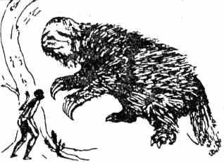 В отличие от современных ленивцев такое животное не могло жить на деревьях. Судя по тому, что мы знаем о нем сегодня, оно выглядело как огромный лохматый медведь со страшными, точно серпы, когтями. Стоять на задних лапах для него, видимо, было делом привычным. Об этом свидетельствует наличие у чудовища тяжелого мощного хвоста, строение его таза и задних конечностей, служивших ему надежной опорой, а также структура его позвоночника. Впрочем, в Карсон-Сити, штат Невада, были найдены гигантские отпечатки следов, подтверждающие такое предположение[25]. Если иногда зверь и опирался на передние лапы (подобно кенгуру, когда он не скачет, а передвигается не торопясь), то их упор был настолько слабым, что тяжеловесными задними лапами он сразу же затаптывал следы передних.
