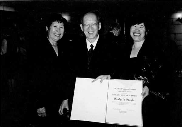 Вскоре после того, как я узнала, что получила постоянное место в Нью-Йоркском университете, я была удостоена премии Троланда Национальной академии наук США. Эта ежегодная награда присуждается лучшим молодым (т. е. «до 40 лет») исследователям в области экспериментальной психологии. Я была счастлива получить ее, и это случилось в апреле 2004 года. Даже мои родители прилетели из Калифорнии, чтобы присутствовать на церемонии в штаб-квартире Национальной академии наук в Вашингтоне. Был там и мой консультант по докторской диссертации Лари Сквайр из Университета Калифорнии в Сан-Диего, член Академии. Мы вчетвером – Ларри, мои родители и я – отметили это событие в ресторане чудесным ужином. Вот мы: